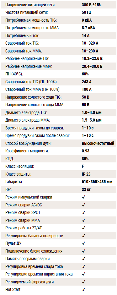 Аппарат серии TECH TIG 315 P DSP AC/DC (E106) оснащен расширенной сенсорной панелью управления. Пользователю предоставлена возможность работы с шестью видами сварки: 4 режима TIG сварки, в том числе импульсная сварка на переменном токе, и 2 режима MMA сварки.