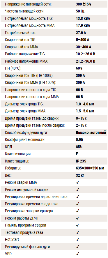 TECH TIG 400P (W322) – это решение для качественной аргонодуговой сварки TIG с применением импульса широкого спектра металлов и сплавов: углеродистых, легированных и нержавеющих сталей, а также для сварки цветных металлов, таких как медь, бронза, латунь. Минимальный сварочный ток от 5А и возможность настройки импульса позволят комфортно работать с тонколистовым металлом. Кроме того TECH TIG 400P (W322) имеет возможность производить полноценную ручную дуговую сварку покрытым электродом MMA.